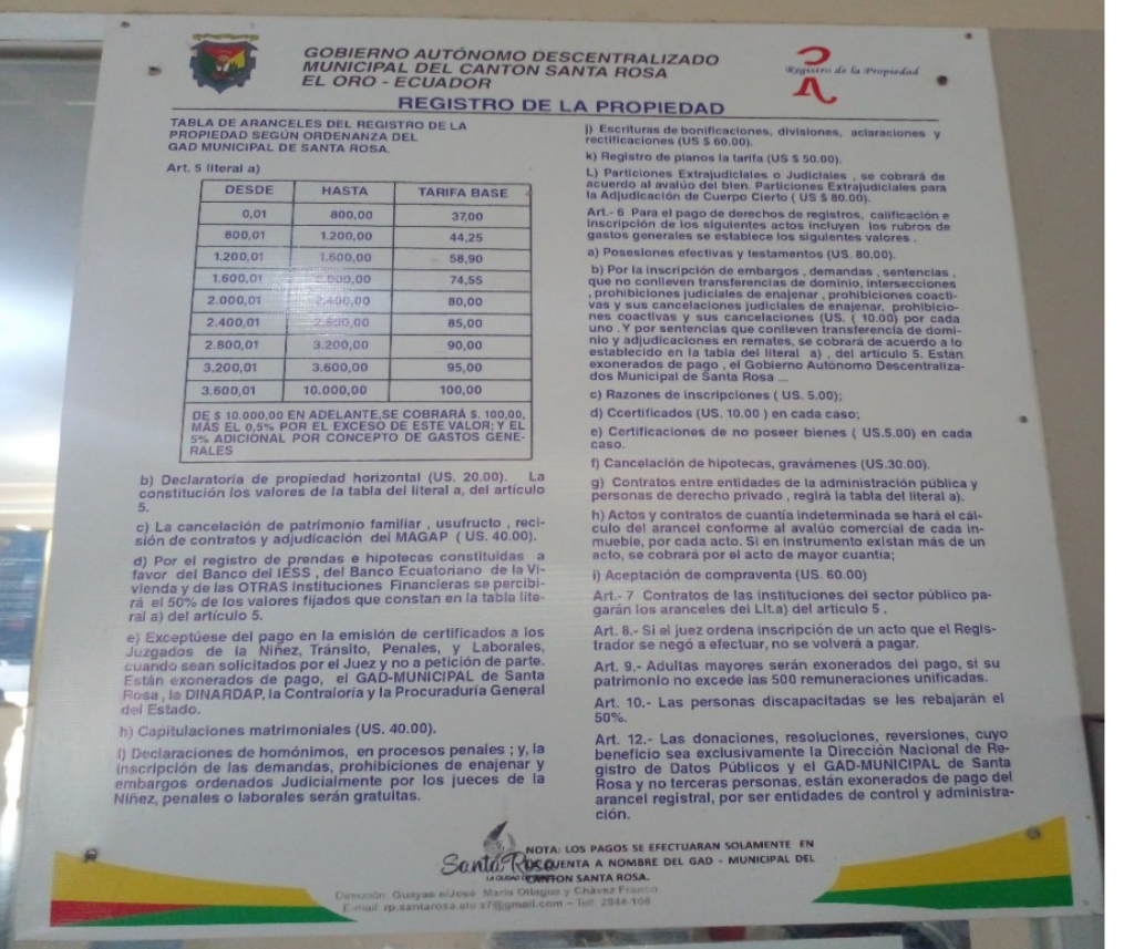 Los Aranceles deberán ser depositados en la forma y Cuenta asignada a nombre del GAD – MUNICIPAL del cantón Santa y queda totalmente prohibido por ningún concepto pagar valores adicionales a ningún funcionario del Registro de la Propiedad y Mercantil.